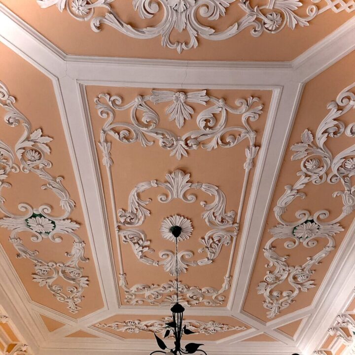 Immerse yourself in the grandeur of a meticulously restored 19th-century mansion, where every room showcases unique sculptured ceilings, preserving the architectural marvels of the past.